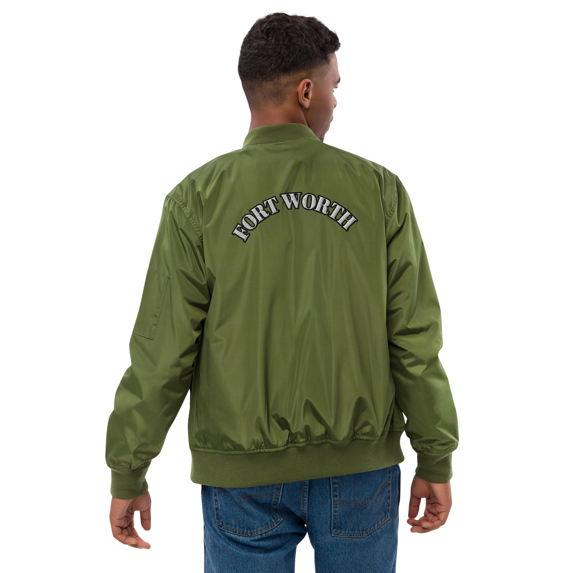 817 WHT font BLK outline Premium recycled bomber jacket